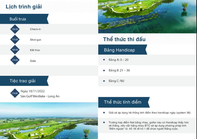 Hiện tại, giải đấu đã thu hút hơn 100 người tham gia, trong đó có các HLV, học viên, đối tác thương hiệu, doanh nghiệp có tiếng trong mảng golf. Cụ thể, giải đấu sẽ được tổ chức vào thứ 6, ngày 18 tháng 11 năm 2022 tại sân golf West Lakes – Long An. Với 3 bảng đấu: Bảng A sẽ từ 0-20 par, Bảng B từ 21-36 và cuối cùng Bảng C dành cho nữ giới. Với 4 giải thưởng: 02 giải Longest Driver và 02 giải Nearest to the Pin.
