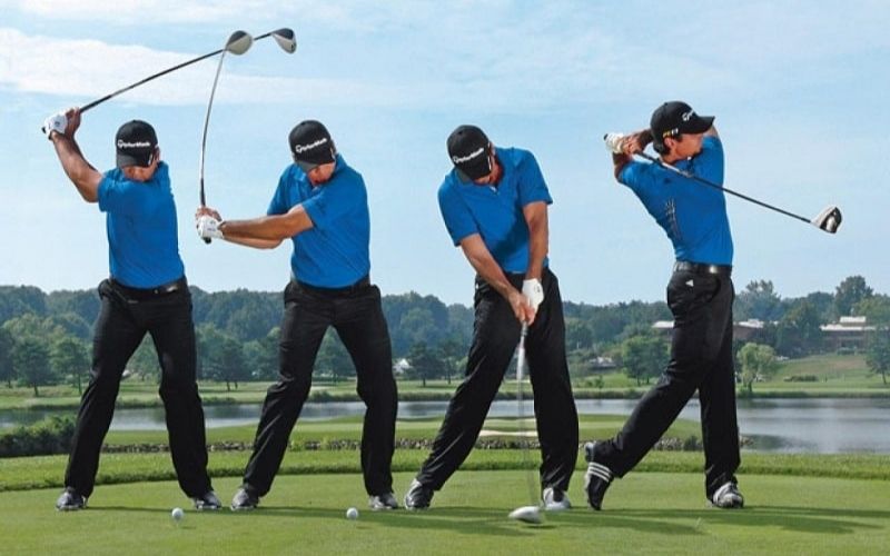 - Khi swing, đầu gậy sẽ đi thẳng từ ngoài vào trong để góc tấn công dốc hơn. Từ đó bóng sẽ bay bổng hơn. Thực hiện một cú swing nhỏ, giữ đầu gối và bàn chân không di chuyển nhiều. Động tác swing thật uyển chuyền và nhẹ nhàng. Nếu bạn muốn bóng đi xa hơn thì hãy thực hiện cú swing rộng hơn và ngược lại