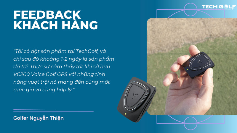 Golfer Nguyễn Thiện có chia sẻ: “Tôi hài lòng về sản phẩm và dịch vụ vận chuyển. Tôi có đặt sản phẩm tại TechGolf, và chỉ sau đó khoảng 1-2 ngày là sản phẩm đã tới. Thực sự cảm thấy tốt khi sở hữu VC200 Voice Golf GPS với những tính năng vượt trội nó mang đến cùng một mức giá vô cùng hợp lý. Nó tiện lợi và nhanh hơn các thiết bị đồng hồ hay máy đo khoảng cách bởi tính năng giọng nói, âm thanh của nó. Với tính năng này đã giúp tôi tiết kiệm được thời gian cũng như linh hoạt hơn trong quá trình chơi golf.”