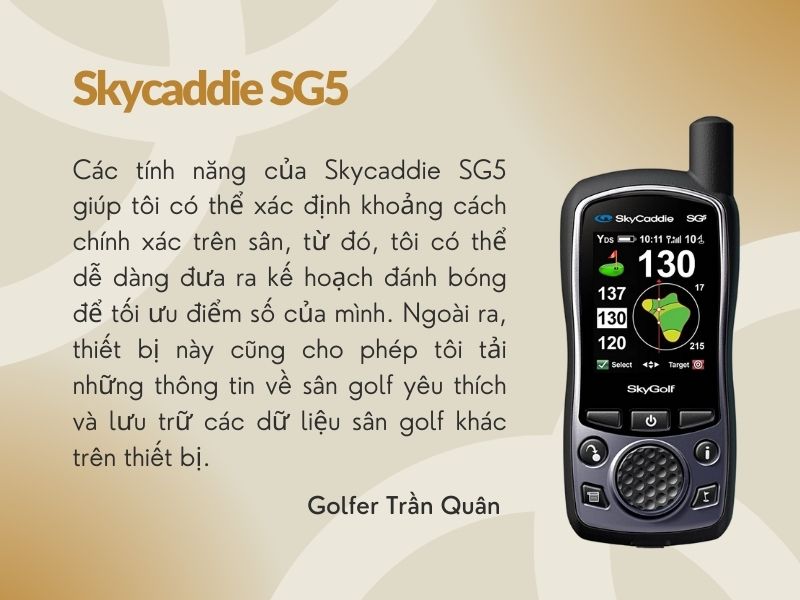 Sau khi sử dụng Skycaddie SG5, golfer Trần Quân đã đưa ra những phản hồi tích cực về thiết bị đo khoảng cách này: “Các tính năng của Skycaddie SG5 giúp tôi có thể xác định khoảng cách chính xác trên sân, từ đó, tôi có thể dễ dàng đưa ra kế hoạch đánh bóng để tối ưu điểm số của mình. Ngoài ra, thiết bị này cũng cho phép tôi tải những thông tin về sân golf yêu thích và lưu trữ các dữ liệu sân golf khác trên thiết bị”.