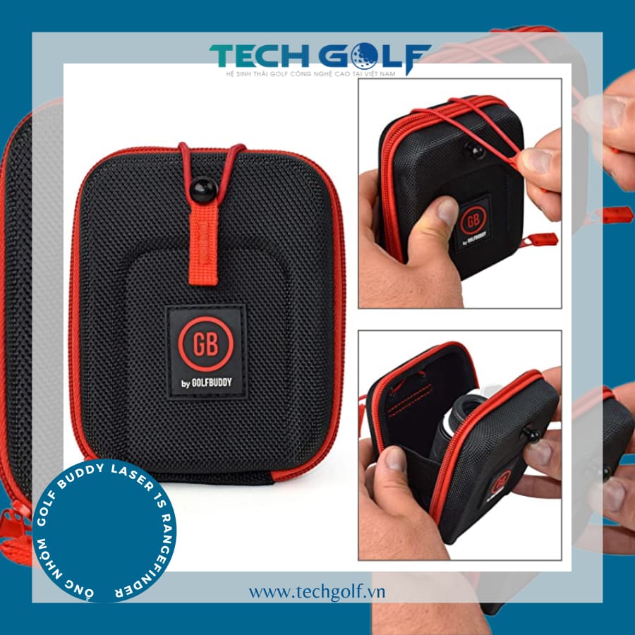 Golf Buddy Laser 1S Rangefinder với hộp đựng cứng, có thể treo trên túi golf, giúp người dùng dễ dàng đóng nút khóa. Tính năng này giúp cho người dùng sử dụng được an toàn mà không cần kéo khóa hộp.