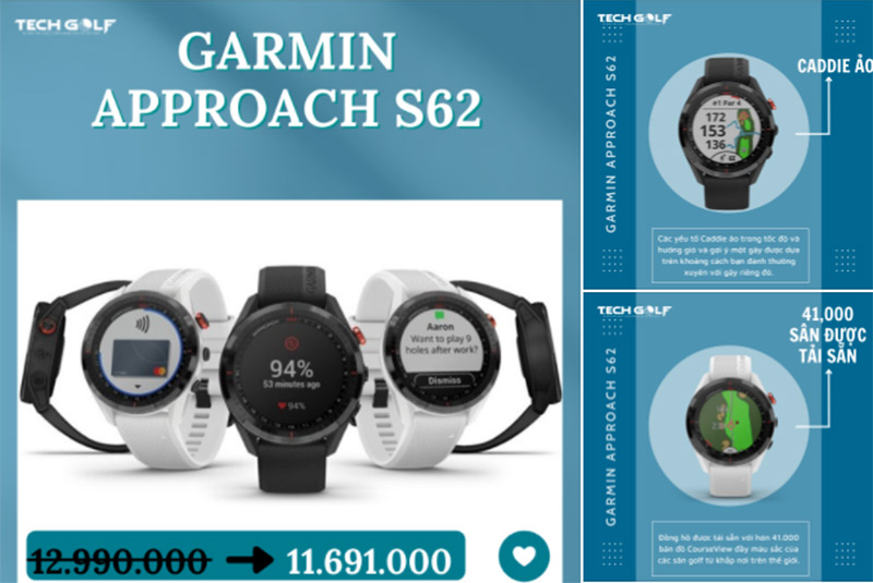 Garmin Approach S62 là phiên bản cao cấp hơn so với Approach S12, sở hữu tất cả các tính năng cơ bản mà golfer cần để cú đánh hoàn hảo. Trong đó đáng chú ý phải kết tới khả năng: xem trước khoảng cách tới green; tải sẵn 41.000 bản đồ sân golf, khóa học trên toàn thế giới; xem trước các chướng ngại vật; Cung cấp đầy đủ thông tin tốc độ, hướng gió và tư vấn chọn gậy; Tính năng theo dõi sức khỏe, đo nồng độ Oxy khi tập luyện, theo dõi mức độ stress,…